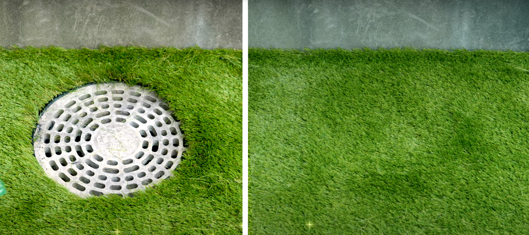 雨水桝や汚水桝の上にも人工芝を接着し、桝の存在感を消すことで、庭全体に一体感のある美しい仕上がりに。